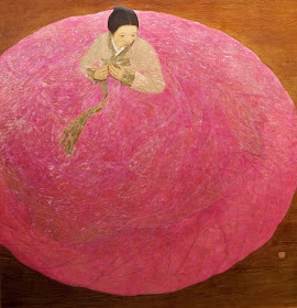I came across 김덕용's (Kim Duck Yong) art while browsing Found Mag online. I was instantly captivated. Certainly, my bias for Audrey Kawasaki is at work here. (Have you caught on their obvious similarity?)The wood Kawasaki works with is usually polished and smooth. Kim however, intentionally applies the grainy and unique textures of old wood in his paintings. The imperfections of the wood and the sensitive captures of humble Korean folks in his painting evoke deep nostalgia and wonder. The grainy texture becomes the lady's skin, the roughness of the wood becomes her silk hanbok. Yet, the maturity of the wood does not deny her beauty thus Kim has effectively captured the meaning of timelessness in his composition. Through the women in his paintings, he expresses Korean beauty in its simplicity and consistency despite the passing of time. This is perhaps one of the biggest factors for the transcendence we feel when gazing upon his art. Collectively, his paintings tell a